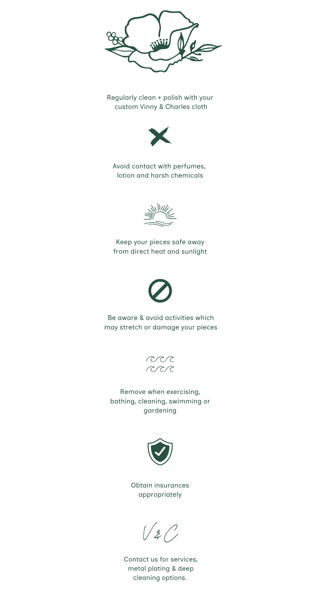 When you’re not wearing your piece we recommend storing it in your V&C jewellery box away from sunlight and direct heat.